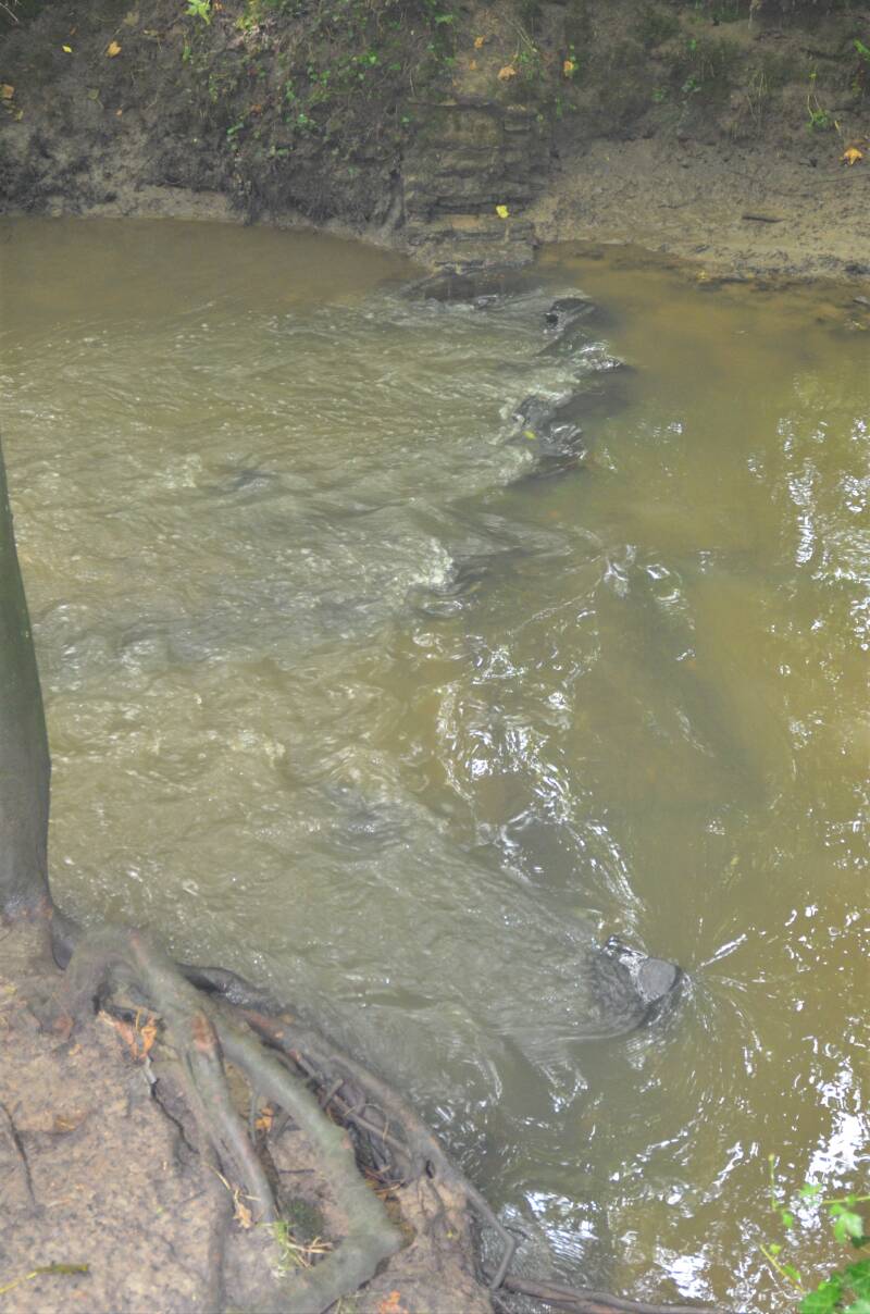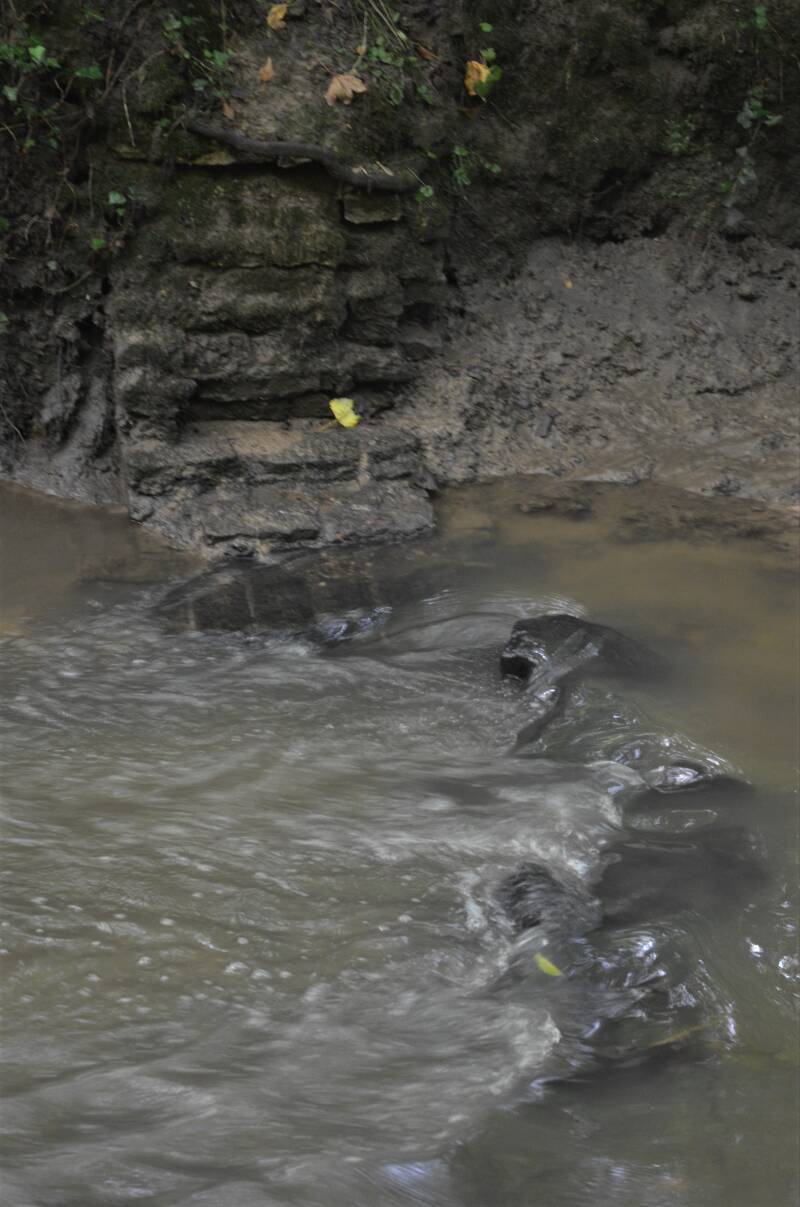 100 meter, links volgen, kom je de restanten tegen van het brugje van rond 1914 waarover de treinaftakking liep naar het vliegveld.. de laatste getuige...